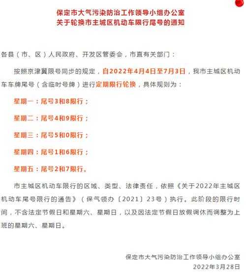 在保定,限号一般遵循“单号双号交替限行”的原则。这就意味着,根据车辆号牌的尾号,单双号的交替限行会在工作日进行。通常情况下,周一至周五的限号时间为早上7:00至晚上9:00。大家一定要在出行前提前查询一下自己的尾号是什么,并做好相应规划!